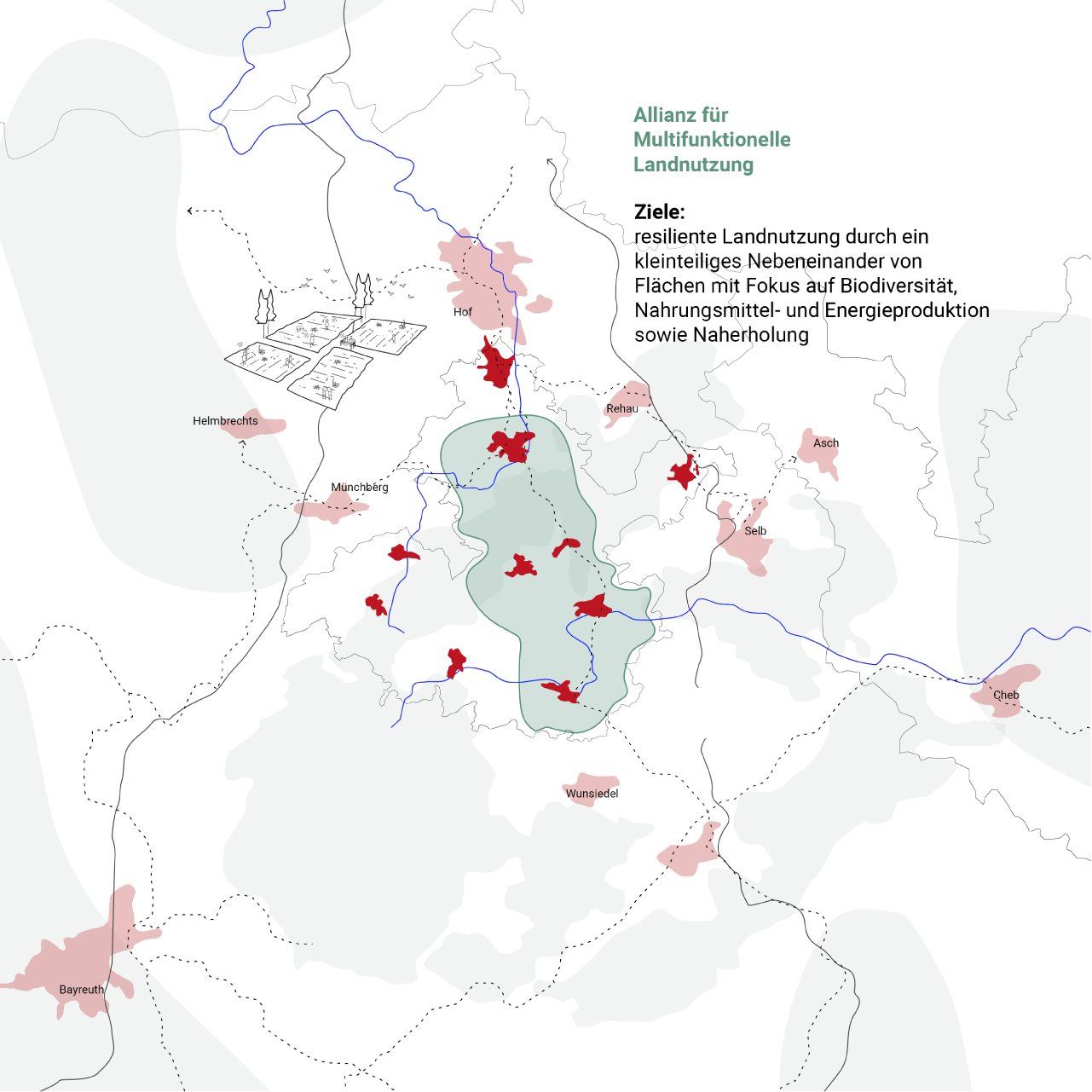 Die Pioniergemeinden der Allianz für multifunktionelle Landnutzung sind prioritär: Röslau, Marktleuthen, Kirchenlamitz, Schwarzenbach an der Saale.