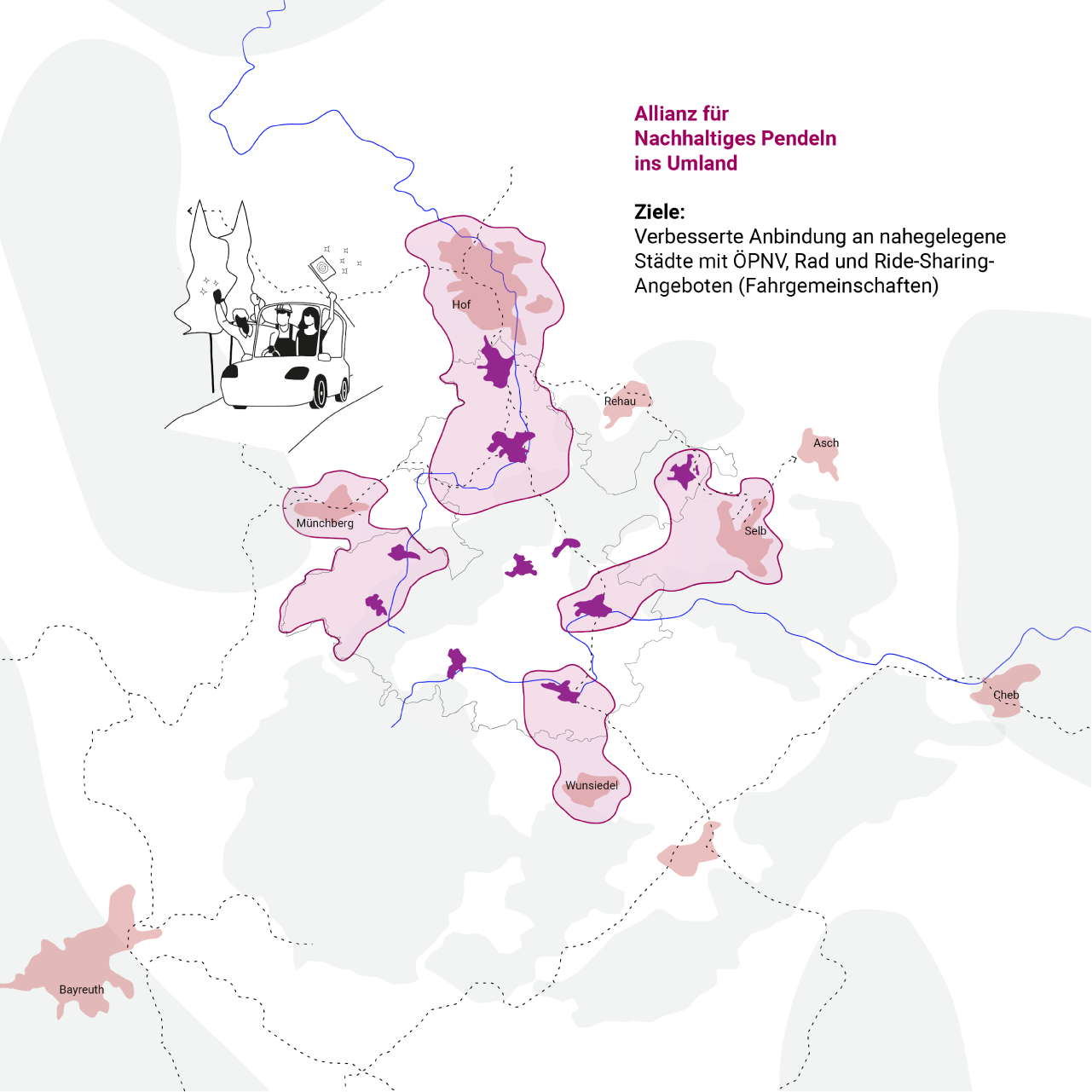 Die Pioniergemeinden der Allianz für nachhaltiges Pendeln ins Umland sind prioritär: Oberkotzau, Schwarzenbach an der Saale, Schönwald, Marktleuthen, Sparneck, Zell im Fichtelgebirge.