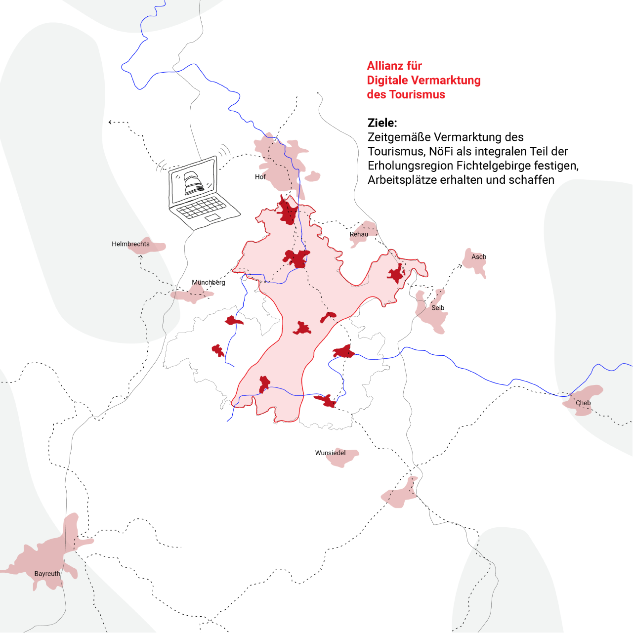 Die Pioniergemeinden der Allianz für digitale Vermarktung des Tourismus sind prioritär: Oberkotzau, Schwarzenbach, Schönwald, Kirchenlamitz, Weißenstadt.