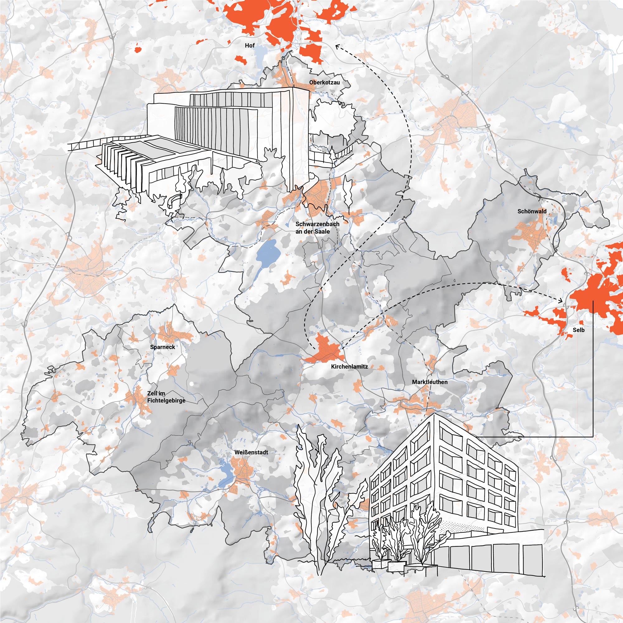 Auch Karin und Wolf fahren deshalb täglich etwa zwanzig Minuten mit dem Auto zu ihren Arbeitsplätzen nach Selb und Hof, die auf der Grafik abgebildet sind.