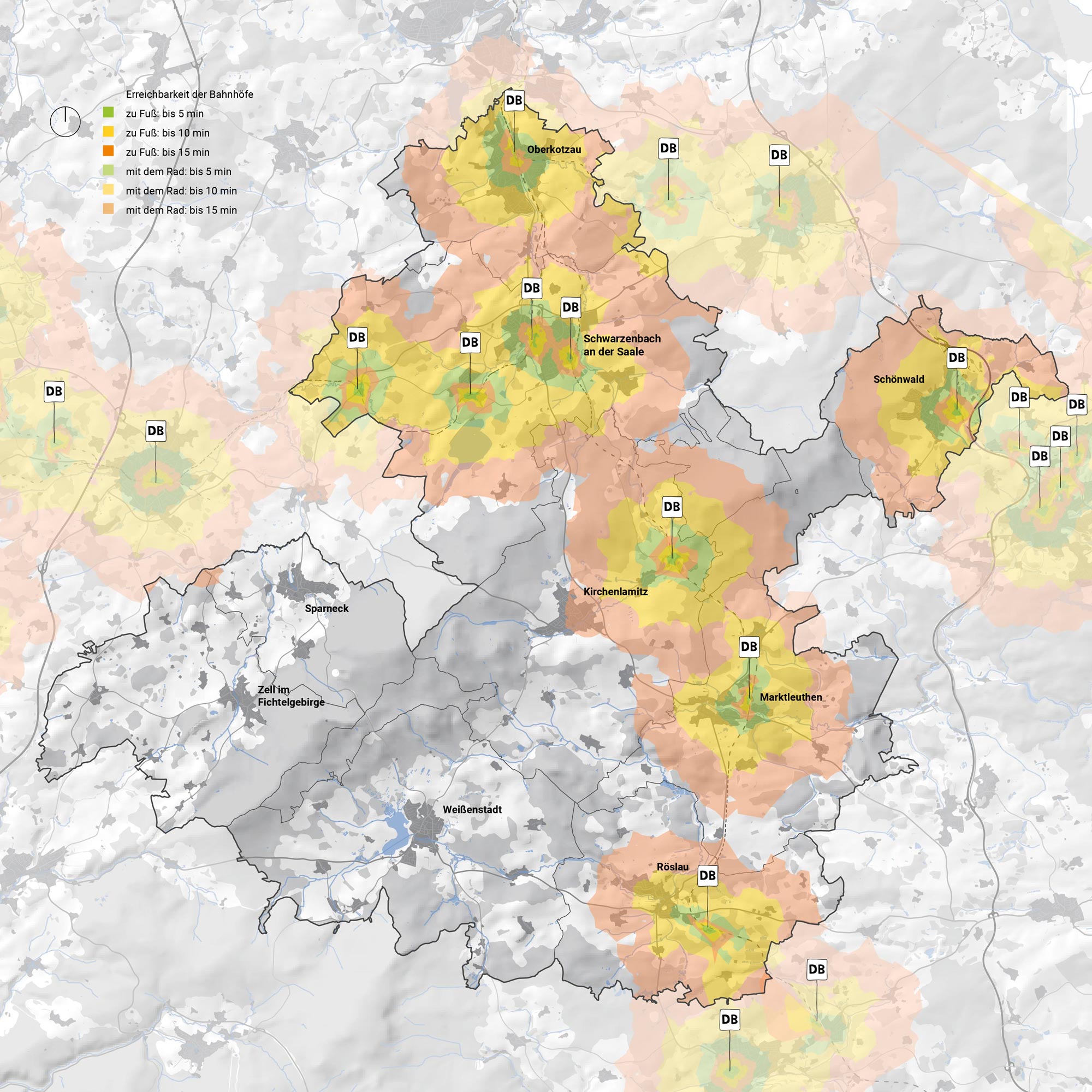 Fuß- und Raderreichbarkeit der Bahnhöfe im NöFi, Quelle berchtoldkrass, unter Verwendung folgender Daten: