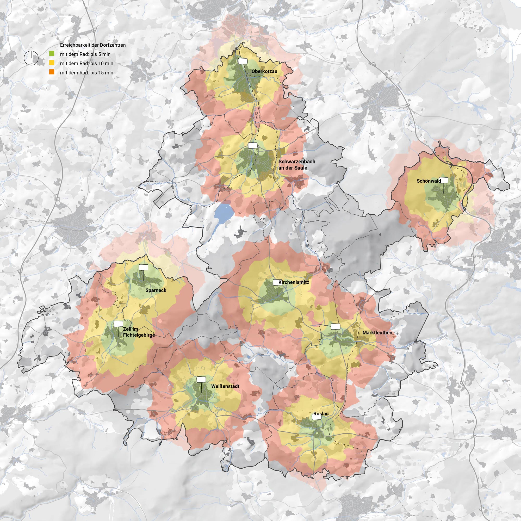 Errechbarkeit der Ortszentren mit dem Fahrrad, Quelle berchtoldkrass, unter Verwendung folgender Daten: