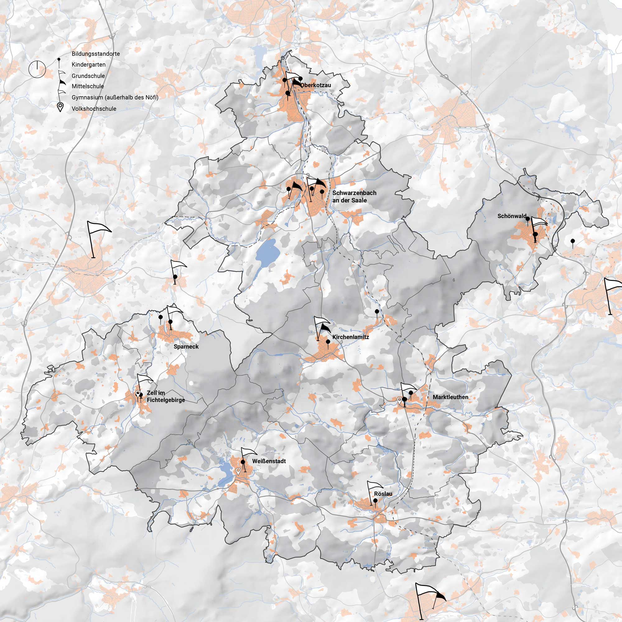 Schulstandorte: Kartierung der Standorte auf Basis des Geoportal Hochfrankens (https://www.geoportal-hochfranken.de/) und OpenStreetMap-Daten.