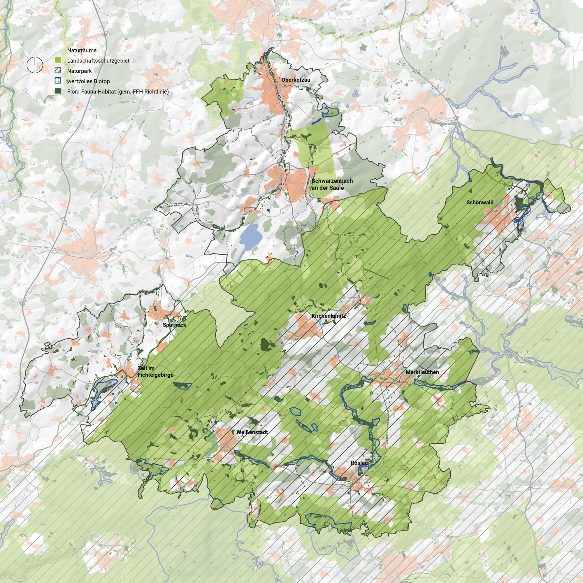 Die Karte verortet neben den bestehenden Landschaftsschutzgebieten und Naturparks auch die wertvollen Biotope und Flora-Fauna-Habitate (FFH), spezielle europäische Schutzgebiete, die dem Schutz von Tieren, Pflanzen und Ökosystemen gewidmet sind.