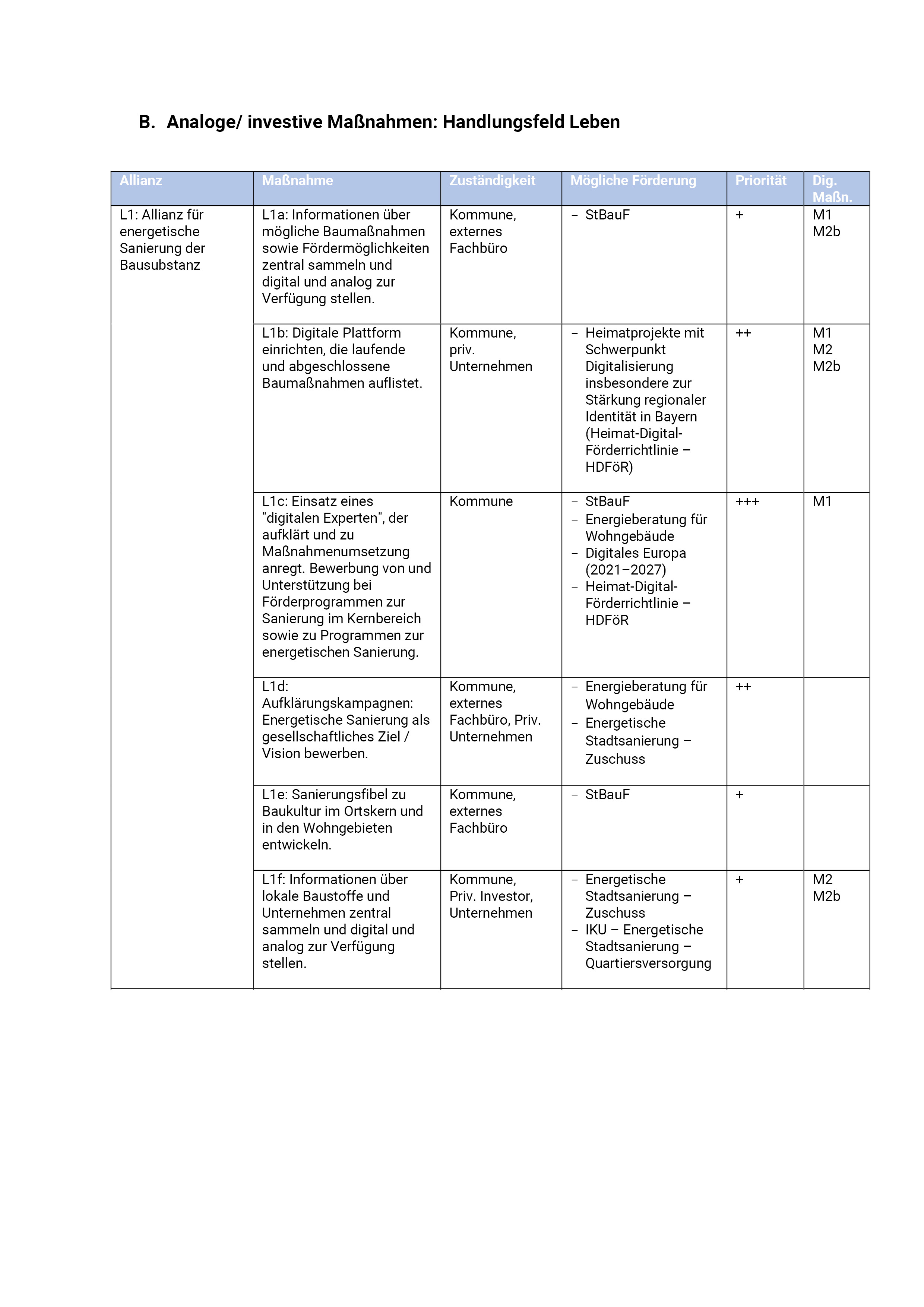 - L1d: In der weiteren Bearbeitung Maßnahmen zu Beratungsangeboten präzisieren, um Redundanz zu vermeiden. „Beratungen werden von BAFA, KfW gefördert.“