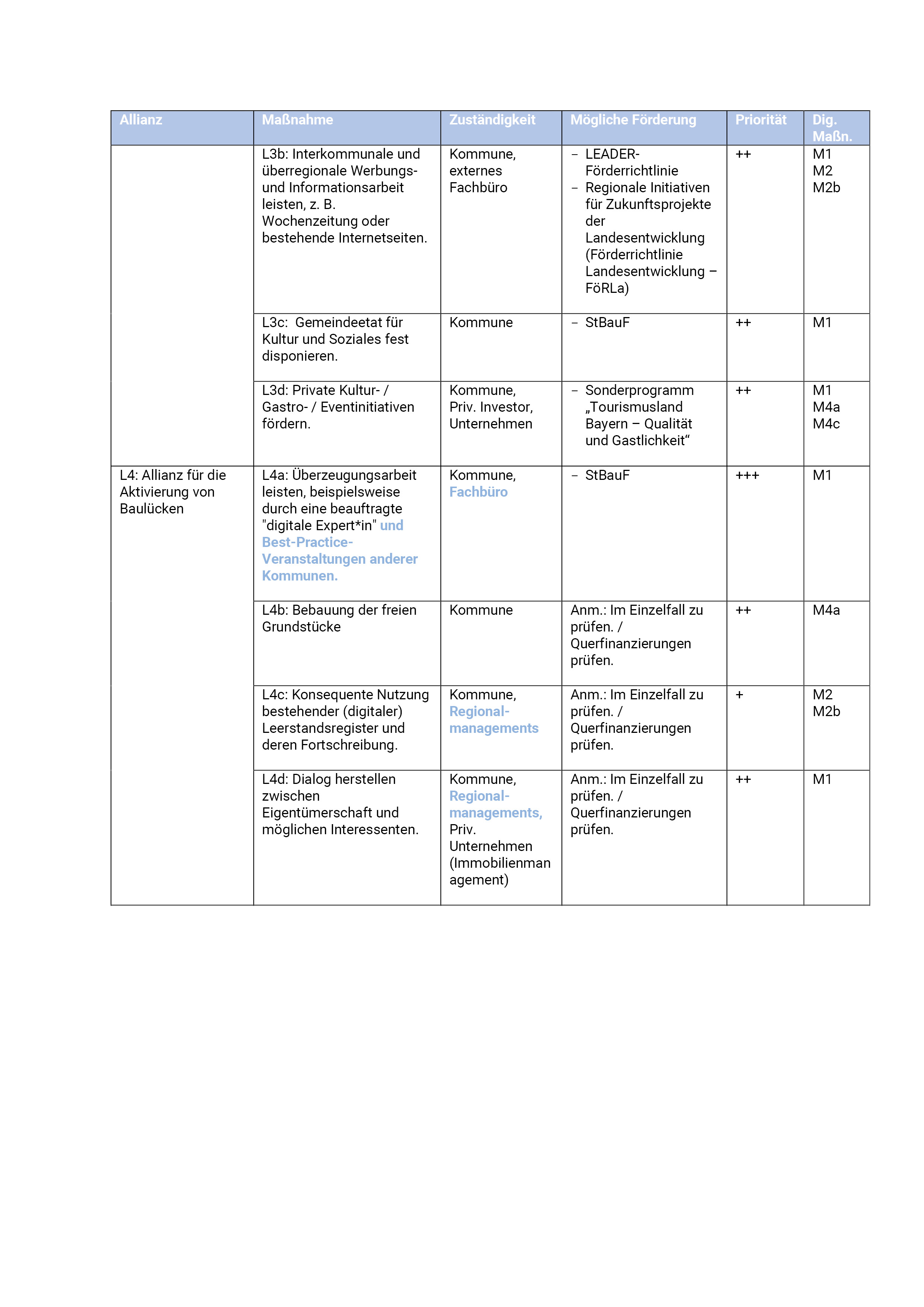 - L4c: Die konkretisierte Maßnahme könnte wie folgt lauten: „Interkommunale (digitale) Erfassung des Innenentwicklungspotentials, Bewertung und Gegenüberstellung zu Bedarf (für Wohnen und Gewerbe), sowie konsequente Nutzung und Fortschreibung.“