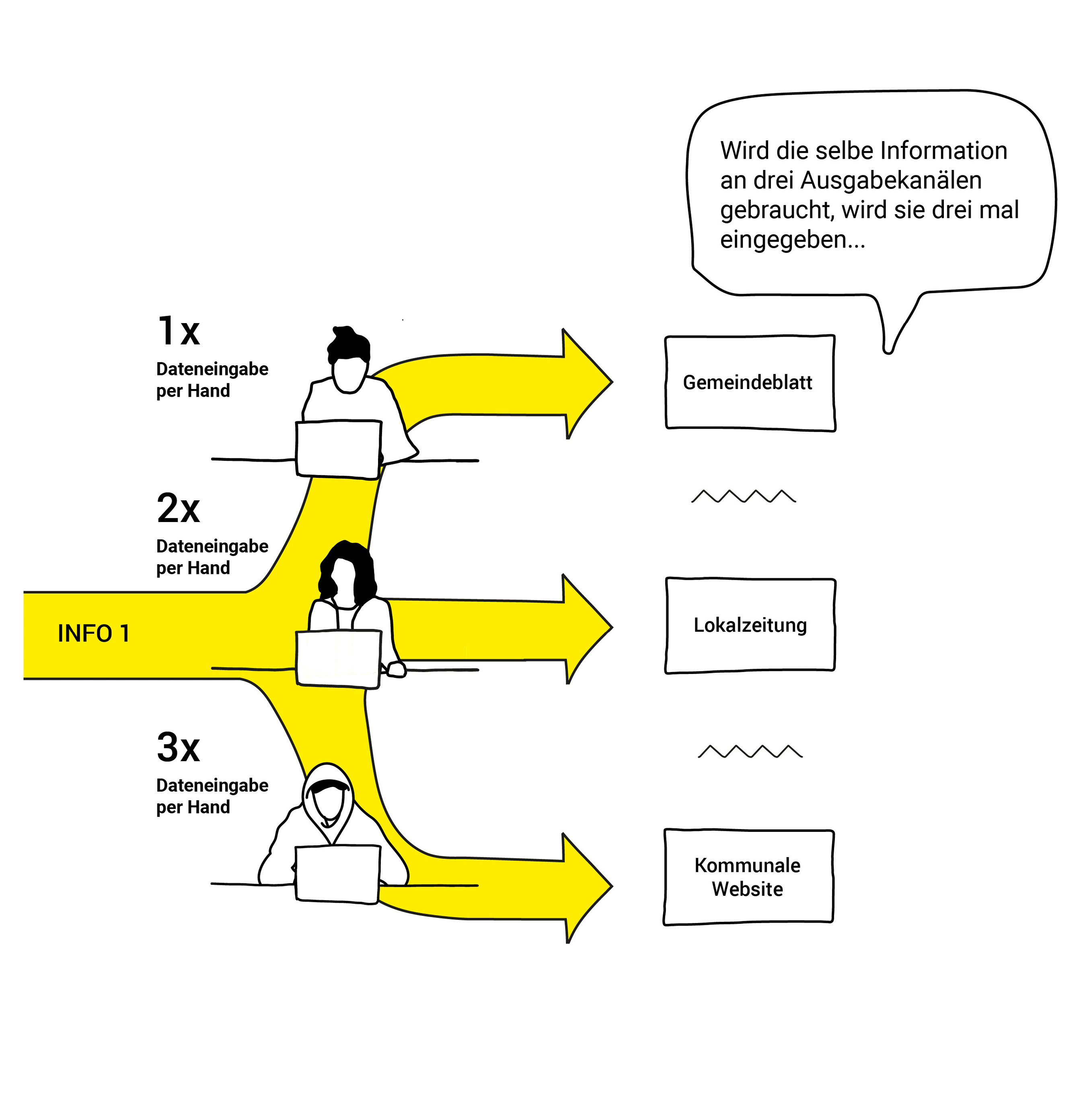 Soll diese Information nicht nur im Gemeindeblatt, sondern auch auf der kommunalen Website erscheinen, gibt die selbe oder eine andere Person diese Information erneut händisch in den Computer ein, damit die selbe Information in zwei Ausgabekanälen erscheint. Dieser Prozess potenziert sich ins Unbegrenzte.