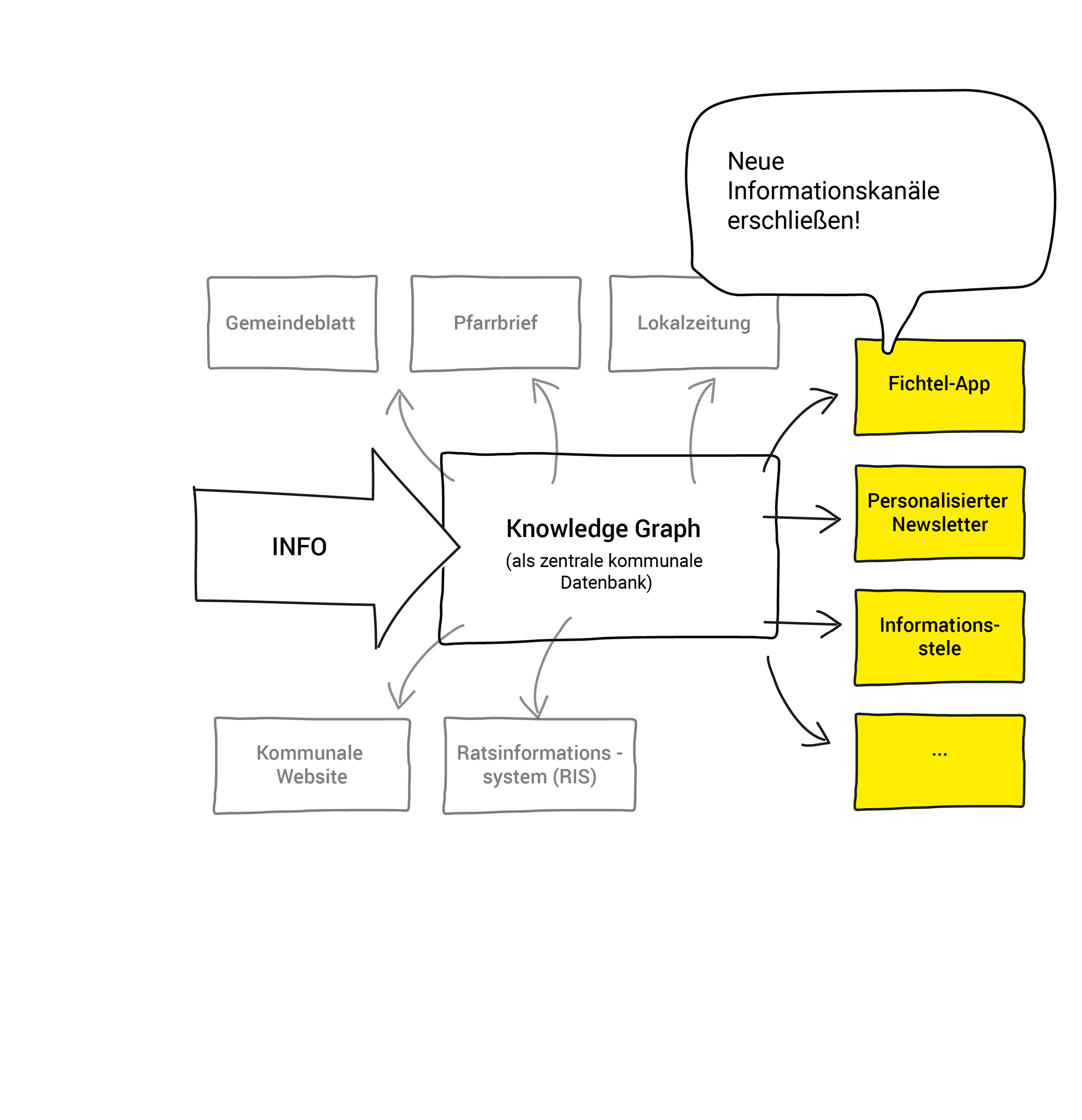 Zusätzlich zur Optimierung des bestehenden Informationsflusses im NöFi können neue analoge und digitale Informationskanäle über den Knowledge Graph erschlossen werden. Beispiele hierfür sind die Fichtel-App, Informationsstelen oder personalisierte Newsletter.